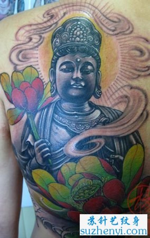 背部彩色观音莲花纹身_宗教纹身图案大全_纹身图吧