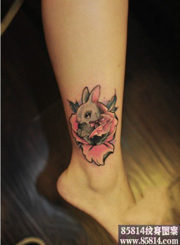 腿颈部花朵包围的兔子刺青作品_植物纹身图案大全_纹身图吧
