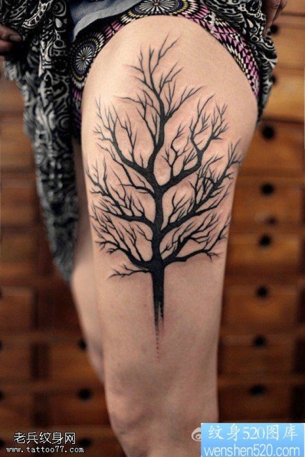 大腿上一棵没有树叶的大树纹身_植物纹身图案大全_纹身图吧