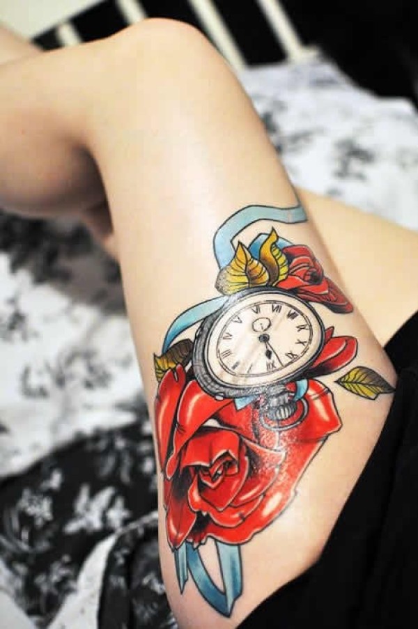 腿部漂亮的花朵和时钟纹身_植物纹身图案大全_纹身图吧