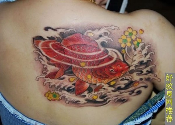侧背上洒落花瓣点缀的金鱼纹身图彩色的金鱼纹_植物纹身图案大全_纹身图吧