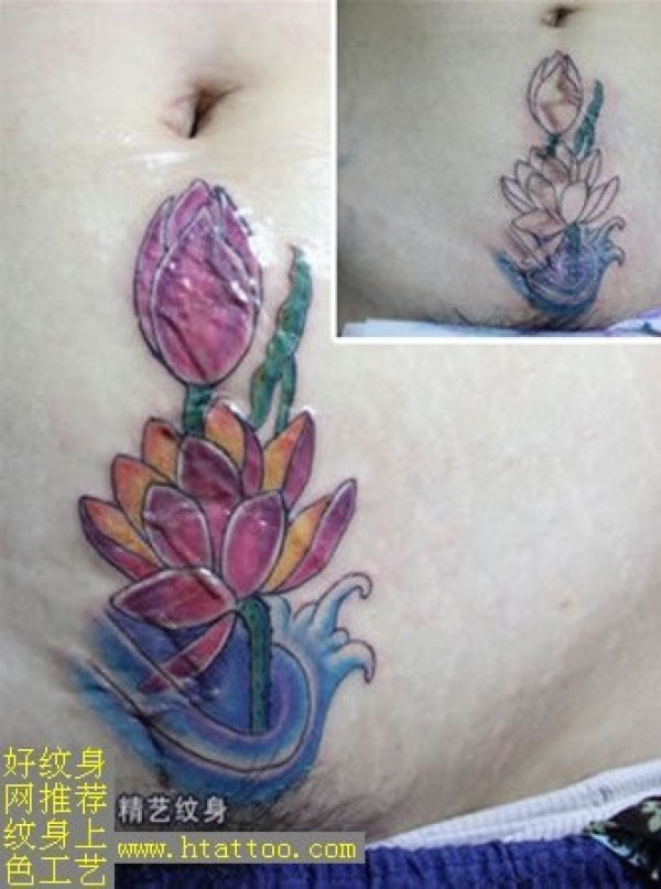 彩绘荷花纹身上色前后对比图上色处理是纹身作_植物纹身图案大全_纹身图吧