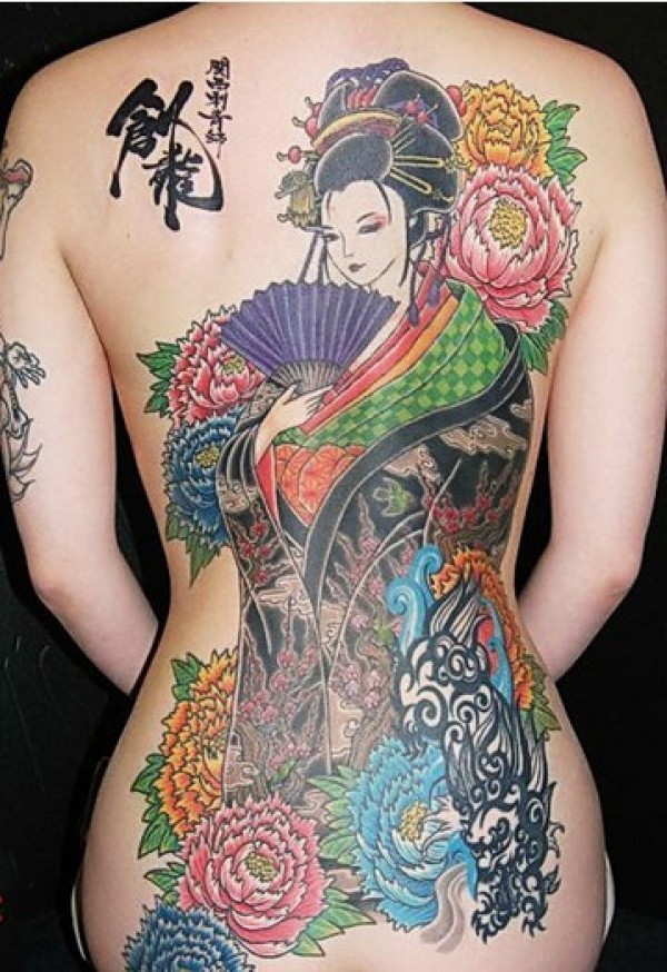 彩绘满后背和服美女纹身图案被花朵包围的美女_植物纹身图案大全_纹身图吧