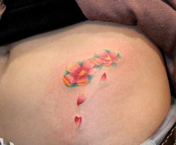 女孩子腹部唯美好看彩色樱花纹身图案_植物纹身图案大全_纹身图吧