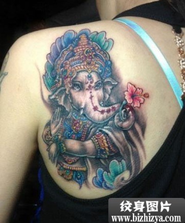 左后肩华丽象神花朵纹身作品_植物纹身图案大全_纹身图吧