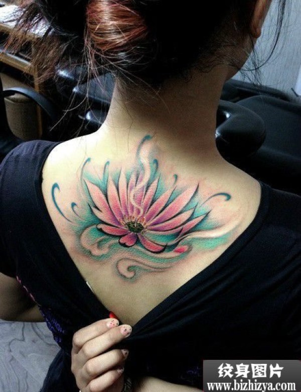 后颈彩色莲花纹身图案图片_植物纹身图案大全_纹身图吧