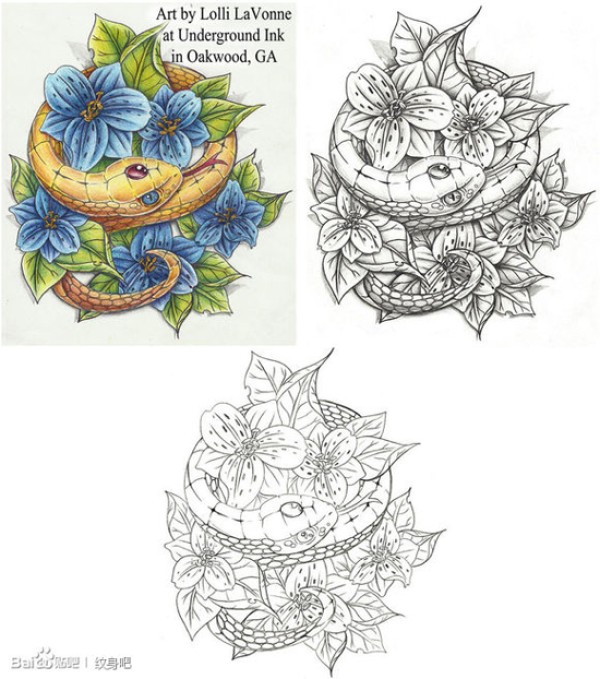 一款精美好看的彩色蛇与花卉纹身图案_植物纹身图案大全_纹身图吧