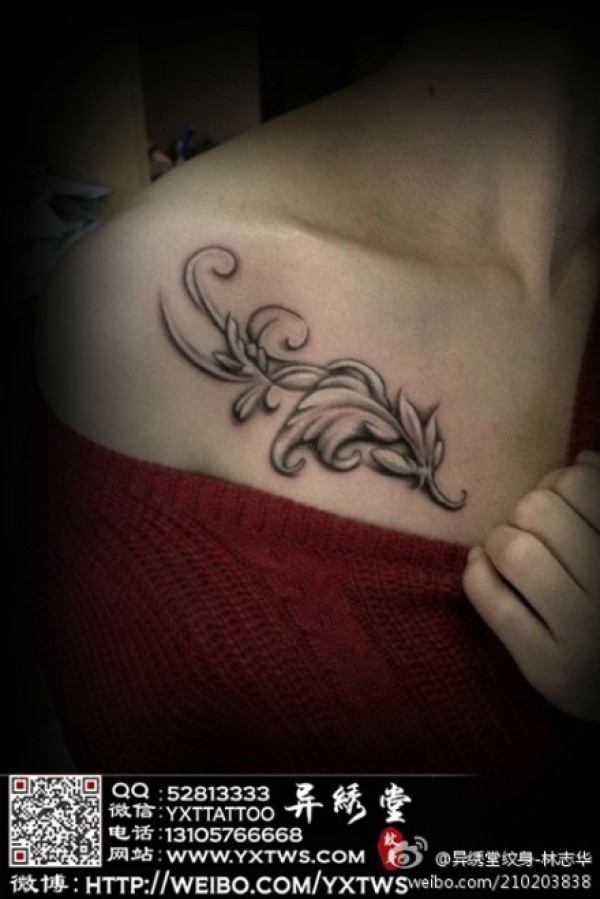 美女胸前唯美潮流的树叶纹身图案_植物纹身图案大全_纹身图吧