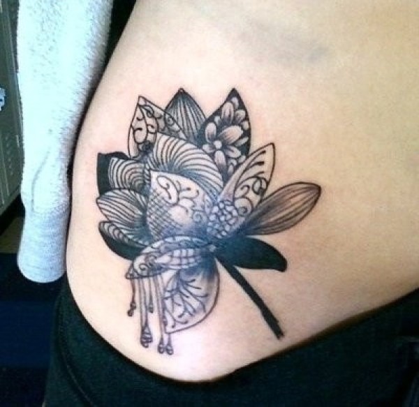 美女胯部唯美经典的黑灰莲花纹身图案_植物纹身图案大全_纹身图吧