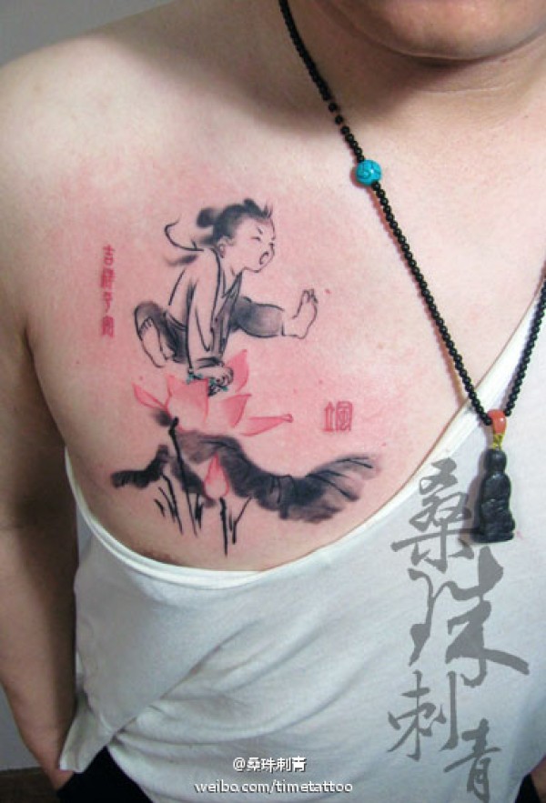 前胸经典的水墨莲花孩童纹身图案_植物纹身图案大全_纹身图吧