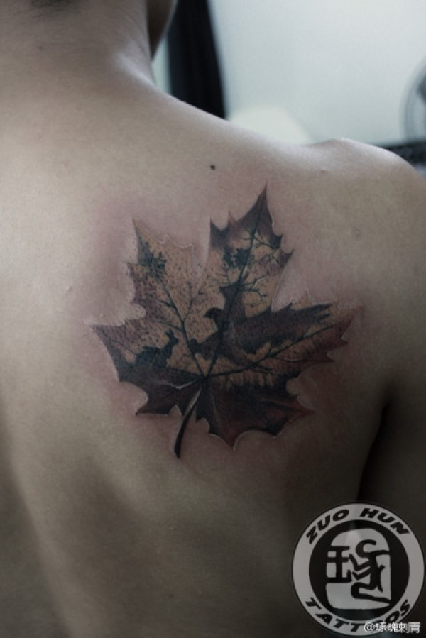 背部时尚经典的树叶老鹰抓兔纹身图案_植物纹身图案大全_纹身图吧