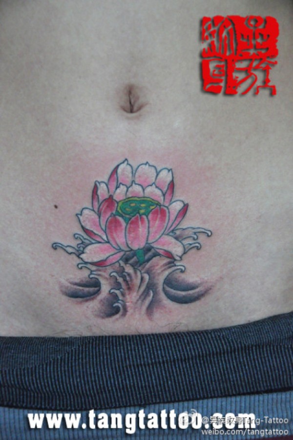 美女腹部漂亮精美的彩色莲花纹身图案_植物纹身图案大全_纹身图吧