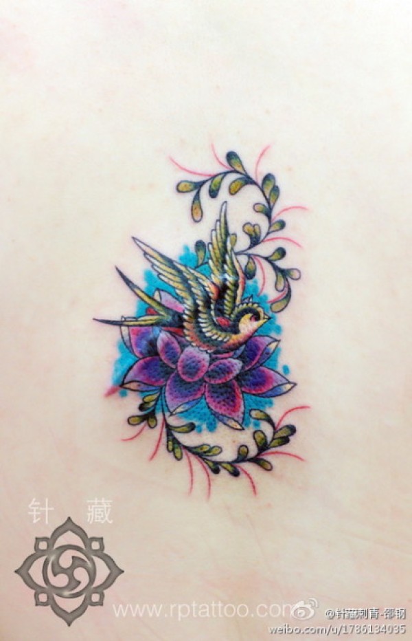 好看的彩色小燕子莲花纹身图案_植物纹身图案大全_纹身图吧