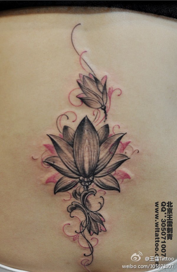 女孩子腰部时尚好看的莲花藤蔓纹身图案_植物纹身图案大全_纹身图吧