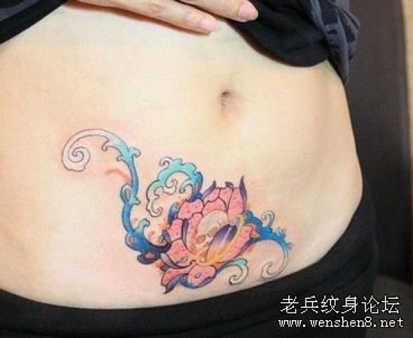 经典时尚美女腹部彩色莲花纹身图案纹身图片_植物纹身图案大全_纹身图吧