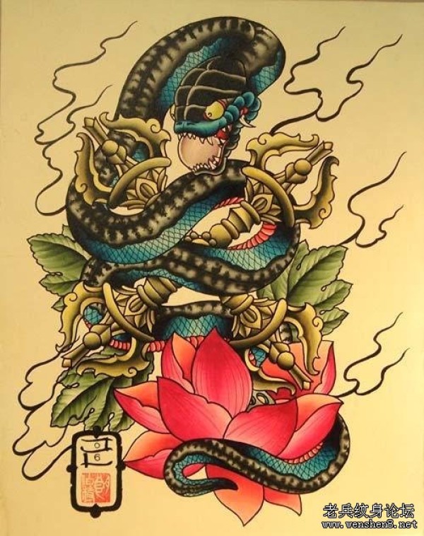 超酷超赞的蛇金刚杵莲花纹身图案大全(精品)_植物纹身图案大全_纹身图吧