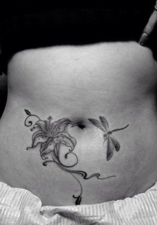 腹部百合花与蜻蜓纹身_植物纹身图案大全_纹身图吧