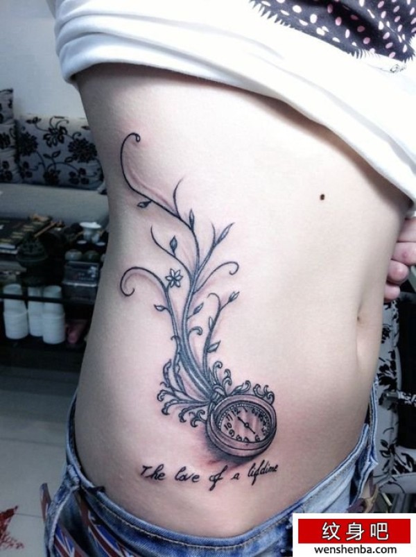 腰部妖娆的花藤和怀表纹身图案_植物纹身图案大全_纹身图吧