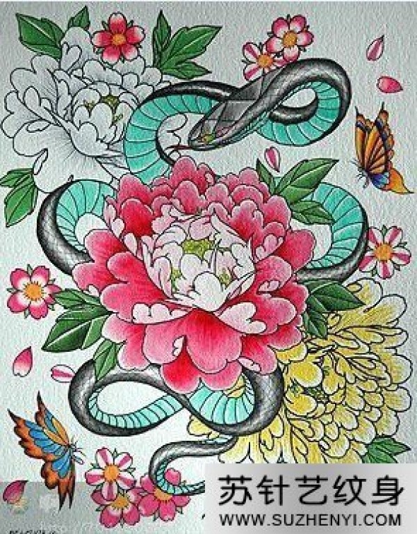 彩色蛇牡丹花纹身_植物纹身图案大全_纹身图吧