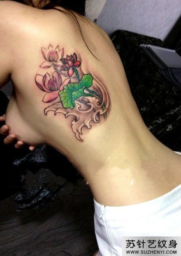 性感时尚美背唯美的彩绘荷花刺青图案_植物纹身图案大全_纹身图吧