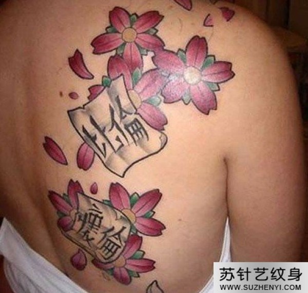 复古时尚彩色花中国字符纹身_植物纹身图案大全_纹身图吧
