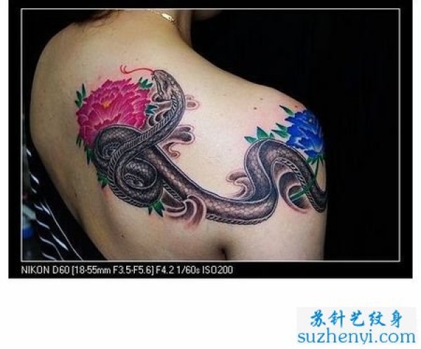 蛇彩色牡丹花纹身图案_植物纹身图案大全_纹身图吧