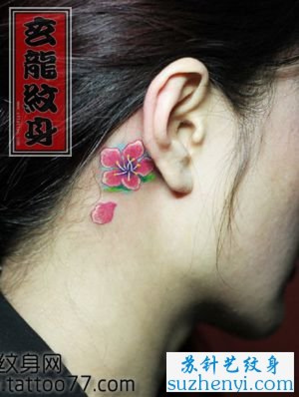 耳部彩色樱花纹身_植物纹身图案大全_纹身图吧