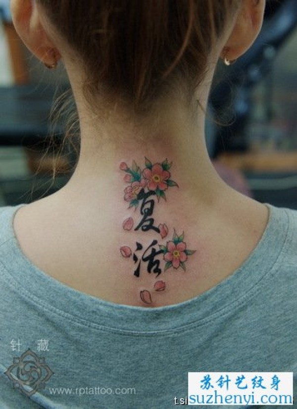 颈部樱花文字纹身_植物纹身图案大全_纹身图吧